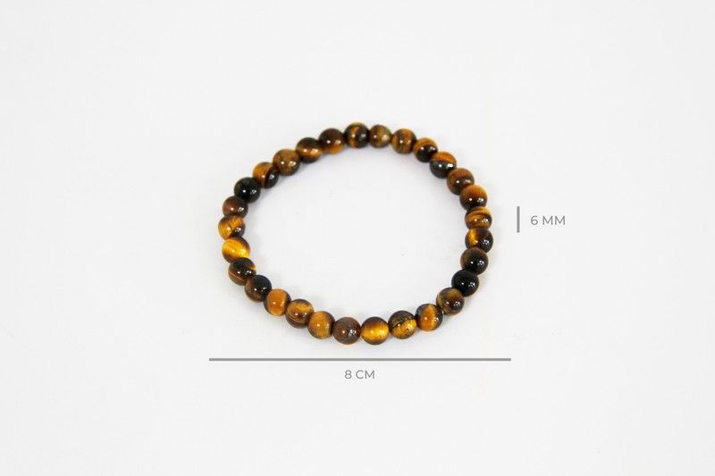 Pulseira de mineral natural olho de tigre com borracha elástica no interior, aproximadamente 5,5 cm de diâmetro.