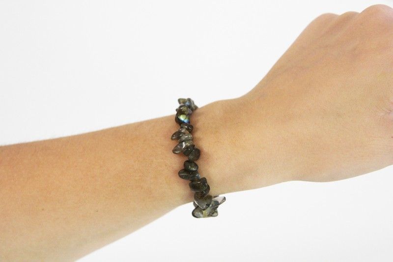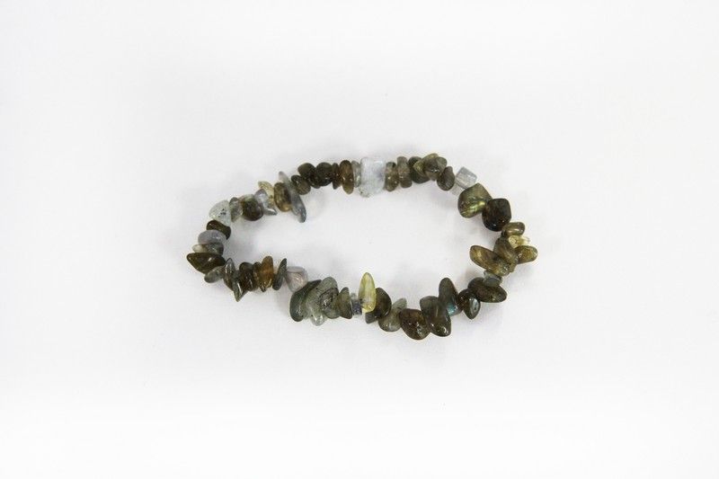 Pulseira Chip de Labradorita com interior em borracha elástica, com aproximadamente 5,5 cm de diâmetro. A ele são atribuídas propriedades de transformação e proteção.