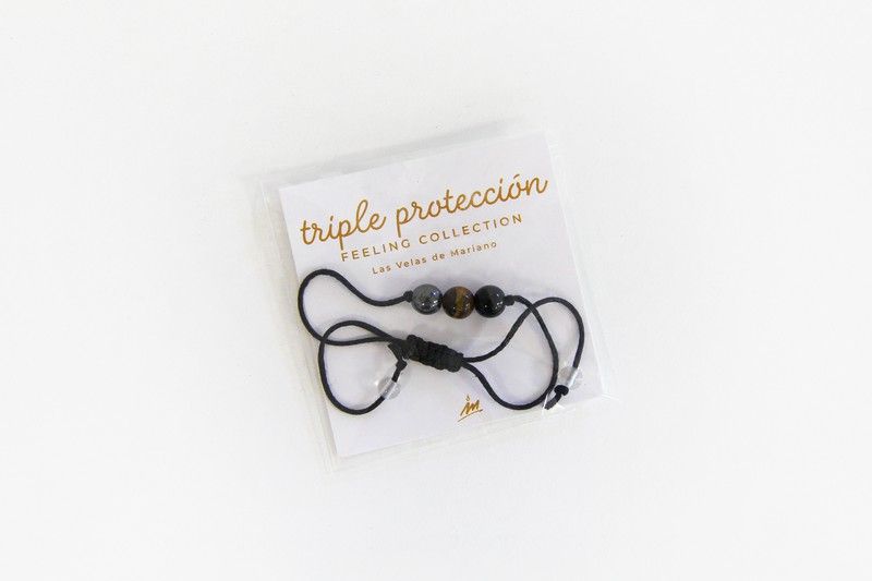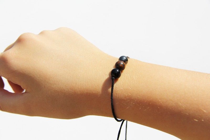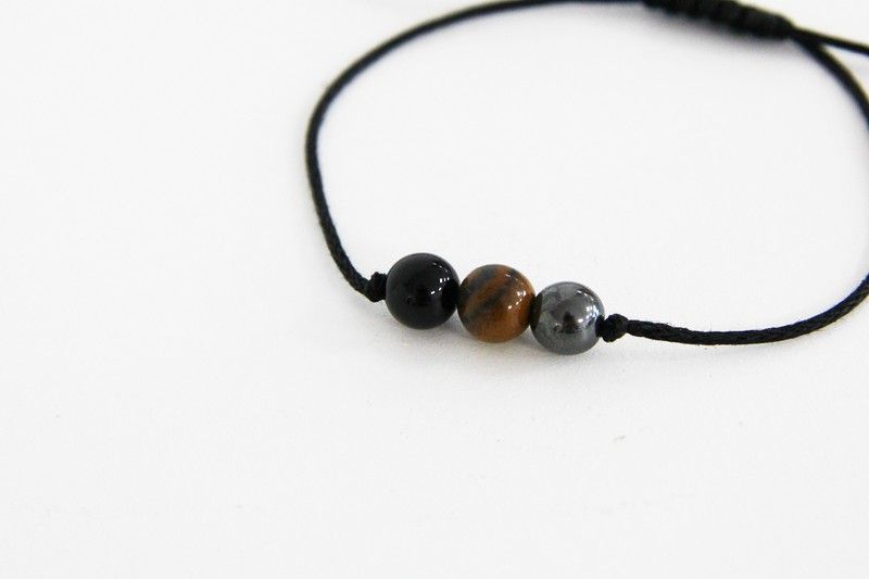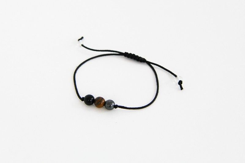 Pulseira de corda ajustável com três minerais redondos com aproximadamente 8 mm de diâmetro. A sua combinação de minerais especiais ajuda a reforçar a proteção.
